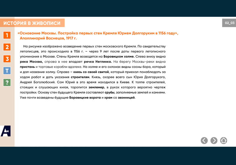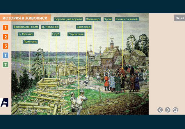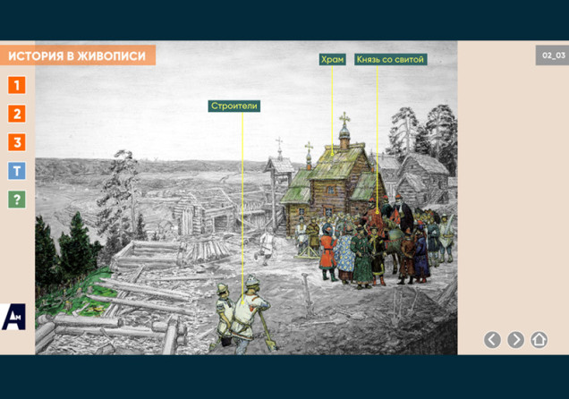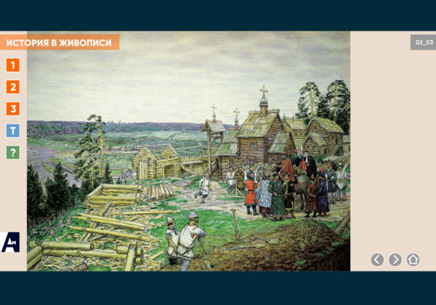 Интерактивная картина. Художественное полотно на историческую тему представлено в трех вариантах: цветная иллюстрация, цветная иллюстрация с выносками, черно-белая иллюстрация с возможностью включать цветной режим и выноски для отдельных элементов. Файл также включает краткое описание картины и задания к ней.