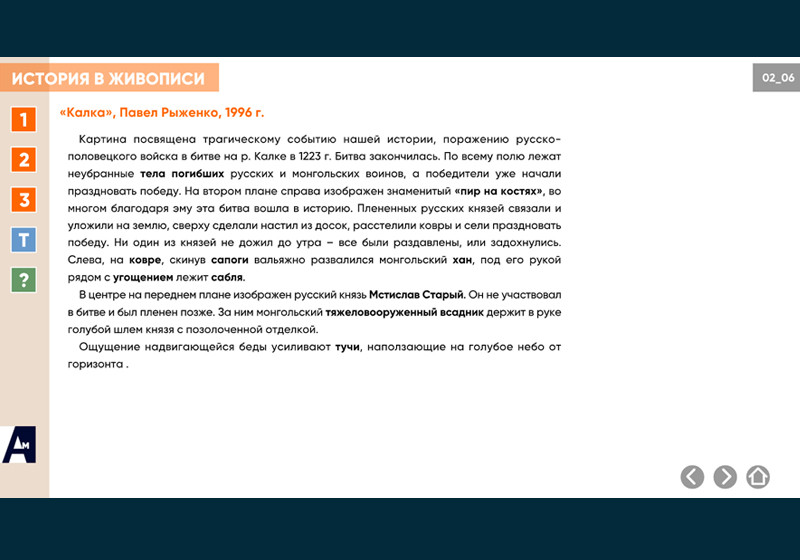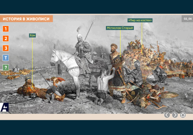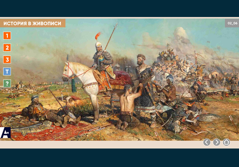 Интерактивная картина. Художественное полотно на историческую тему представлено в трех вариантах: цветная иллюстрация, цветная иллюстрация с выносками, черно-белая иллюстрация с возможностью включать цветной режим и выноски для отдельных элементов. Файл также включает краткое описание картины и задания к ней.