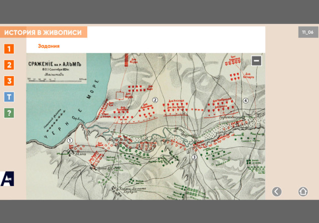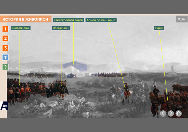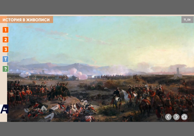 Интерактивная картина. Художественное полотно на историческую тему представлено в трех вариантах: цветная иллюстрация, цветная иллюстрация с выносками, черно-белая иллюстрация с возможностью включать цветной режим и выноски для отдельных элементов. Файл также включает краткое описание картины и задания к ней.
