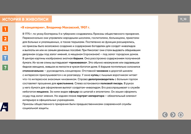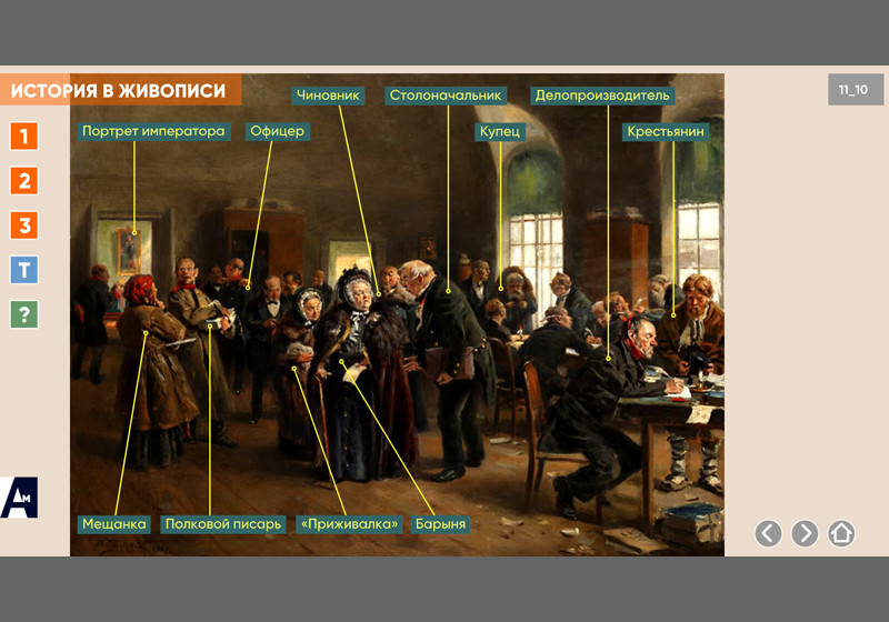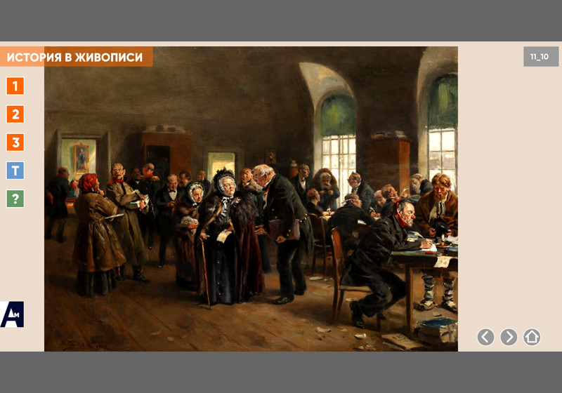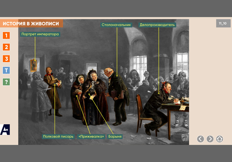 Интерактивная картина. Художественное полотно на историческую тему представлено в трех вариантах: цветная иллюстрация, цветная иллюстрация с выносками, черно-белая иллюстрация с возможностью включать цветной режим и выноски для отдельных элементов. Файл также включает краткое описание картины и задания к ней.
