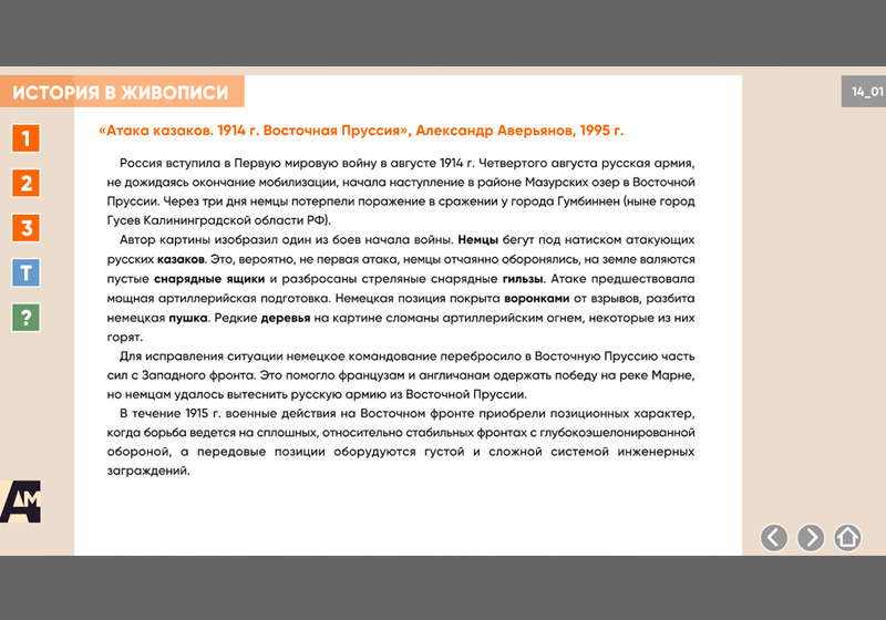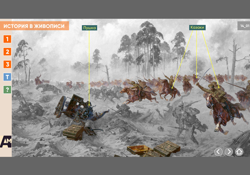 Интерактивная картина. Художественное полотно на историческую тему представлено в трех вариантах: цветная иллюстрация, цветная иллюстрация с выносками, черно-белая иллюстрация с возможностью включать цветной режим и выноски для отдельных элементов. Файл также включает краткое описание картины и задания к ней.