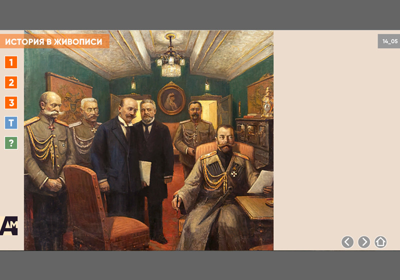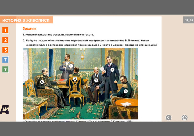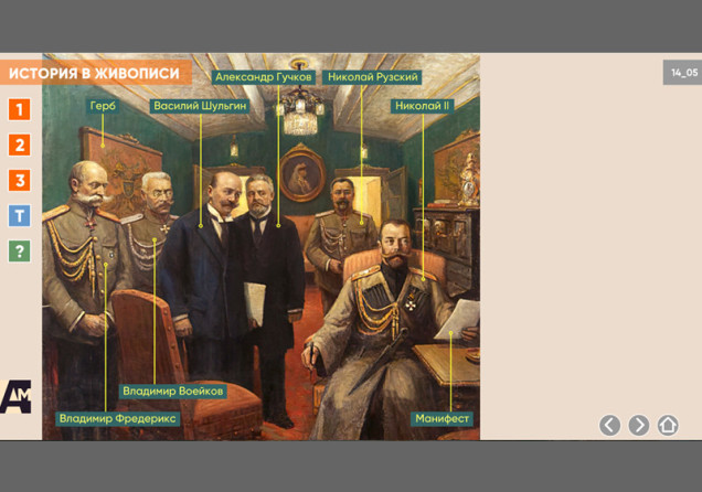 Интерактивная картина. Художественное полотно на историческую тему представлено в трех вариантах: цветная иллюстрация, цветная иллюстрация с выносками, черно-белая иллюстрация с возможностью включать цветной режим и выноски для отдельных элементов. Файл также включает краткое описание картины и задания к ней.