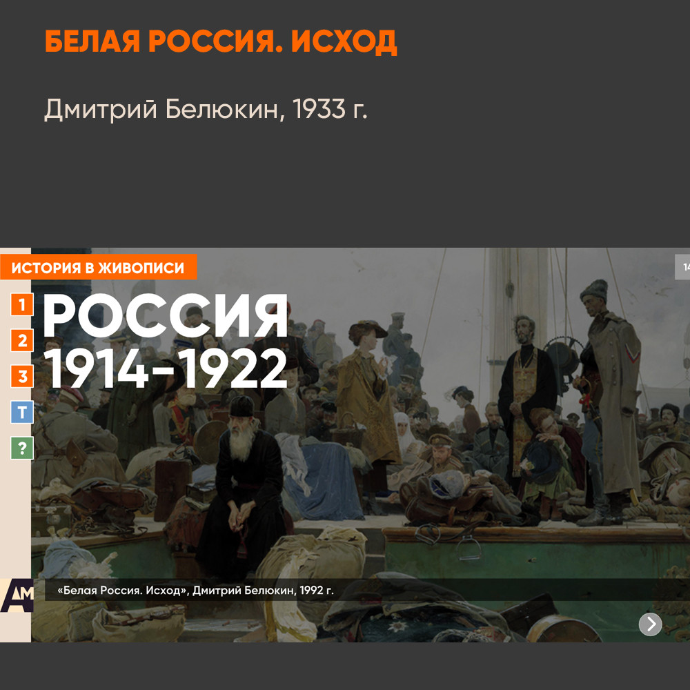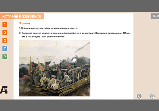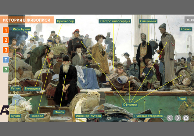 Интерактивная картина. Художественное полотно на историческую тему представлено в трех вариантах: цветная иллюстрация, цветная иллюстрация с выносками, черно-белая иллюстрация с возможностью включать цветной режим и выноски для отдельных элементов. Файл также включает краткое описание картины и задания к ней.