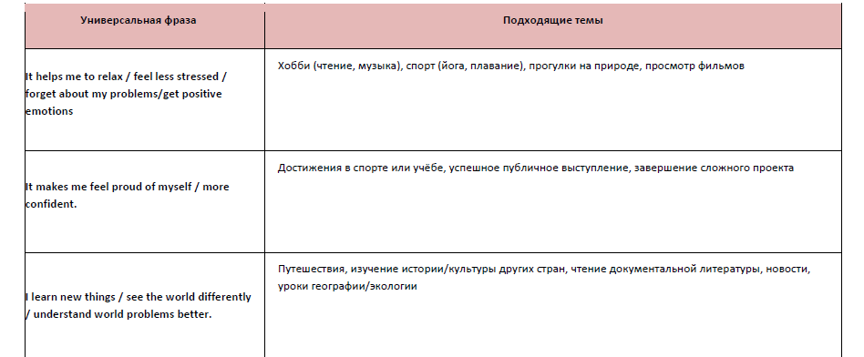 Подходящие темы на русском с примерами (хобби, спорт, прогулки и т.д.).