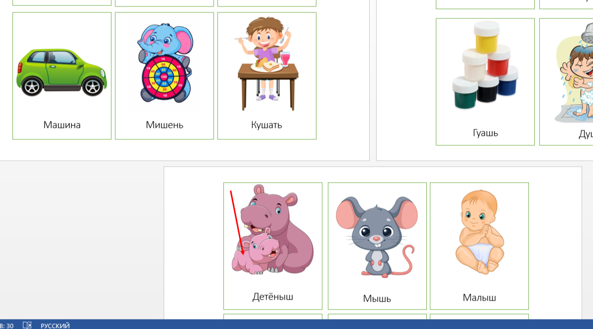 Логопед называет слово, ребёнок находит и поднимает соответствующую карточку.