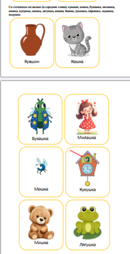 Логопед называет слово, ребёнок находит карточку и произносит его.