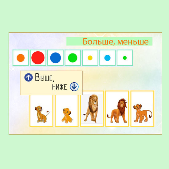 Математические тренажеры включают в себя пять заданий. В иллюстрированных заданиях нужно из нижнего ряда переместить в верхний ряд рисунки и по особому расположить их. В тренажере "Больше, меньше" фигуры разных размеров располагаются в разных заданиях или по мере увеличения размеров, становясь все больше и больше, или по мере уменьшения размеров, становясь все меньше и меньше. В заданиях тренажера "Выше, ниже" нужно показать, как вырастает взрослый лев или как вырастает дерево, становясь все выше и выше, как правильно стоят солдаты в строю, как выше и выше поднимается вертолет в небо и как, наоборот, все ниже и ниже спускается с высоты парашютист.