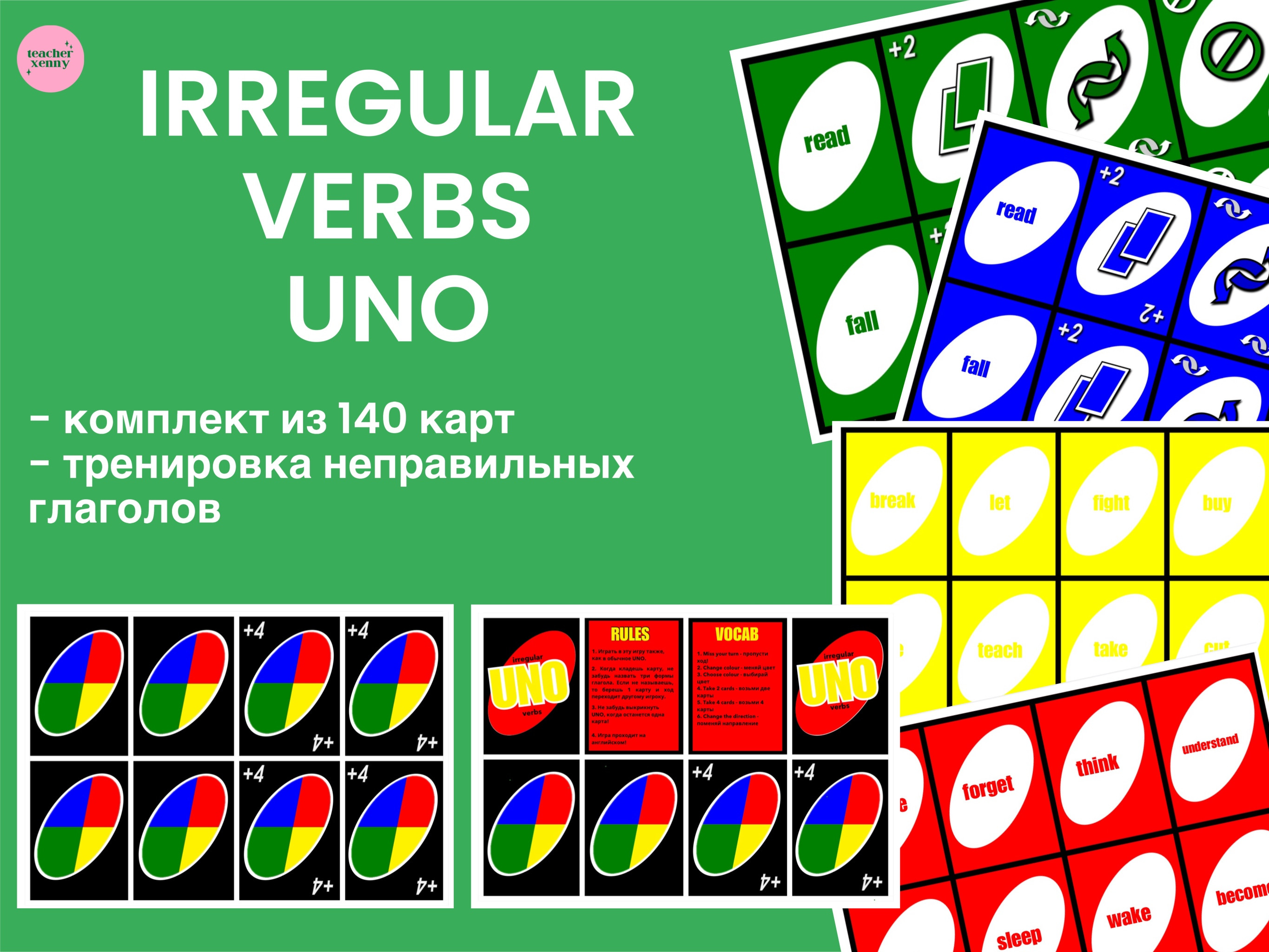 Большой набор карт УНО для изучения неправильных глаголов, состоящий из 140 карт, правил и важного вокабуляра для игры. ПДФ-версия для печати и проведения уроков офлайн.