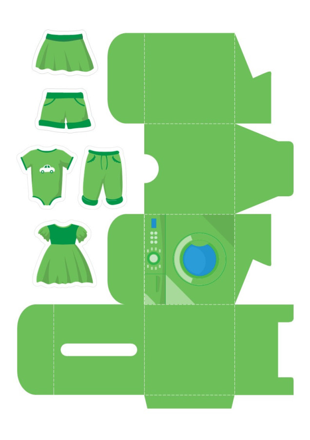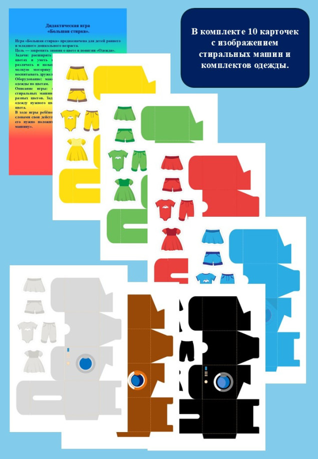 Описание игры: в центр стола ставятся макеты стиральных машинок и вперемешку кладется одежда разных цветов. Задача детей — постирать (заложить) одежду нужного цвета в стиральной машине того же цвета.
