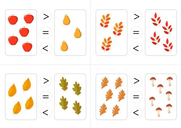 Описание игры: детям выдают карточки с картинками. Задание — поставить нужный знак между карточками, продолжить рисунок, составить уравнение. Выигрывает тот, кто сделает это правильно и быстро.