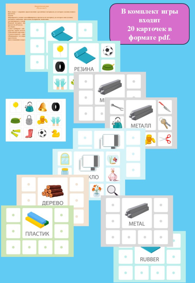 Цель игры: определить из какого материала изготовлен предмет (дерево, стекло, пластик, резина, металл). Вариант игры на английском языке поможет запомнить новые слова.