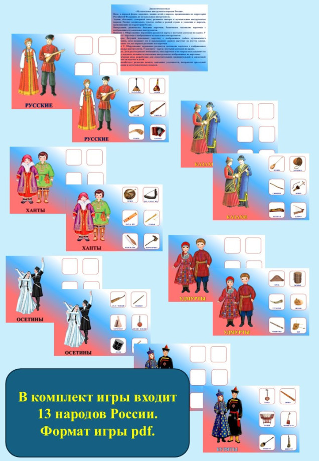 Цель: в игровой форме закрепить знания детей о народах, проживающих на территории Российской Федерации, их музыкальных инструментах.