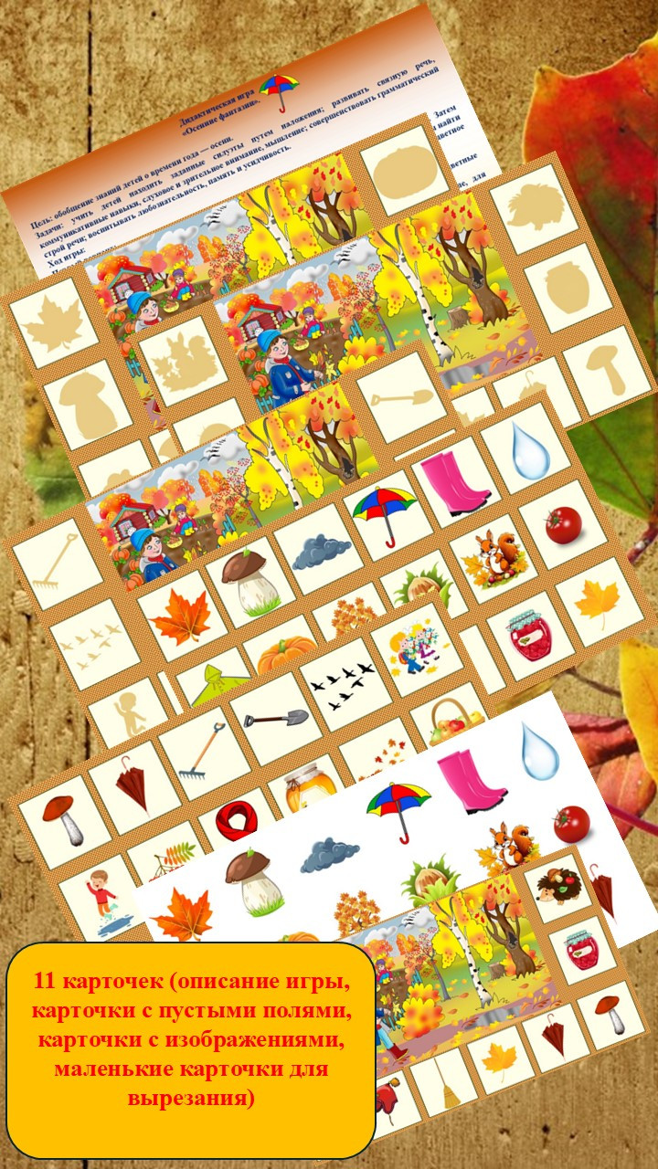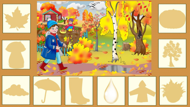 На столе раскладываются все карточки с предметами. Игроку предлагается найти тень и положить цветные предметы на силуэт.