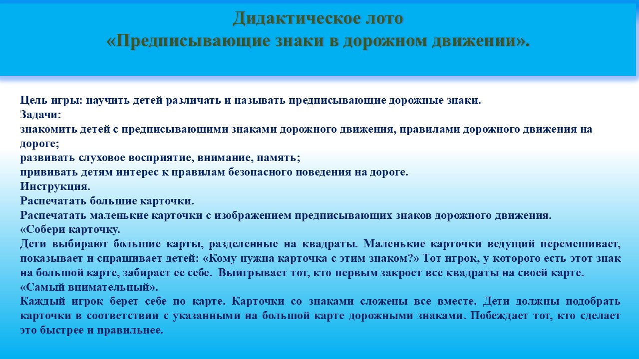 Цель игры: научить детей различать и называть предписывающие дорожные знаки.