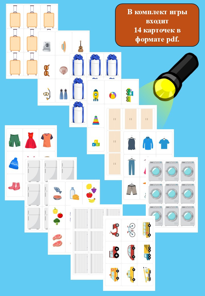 Как играть? Распечатать листы, положить лист с предметами, которые должны быть спрятаны, под лист с соответствующими заграждающими предметами (чемоданы, подарки, шкафы, стиральные машины, холодильники, гаражи). Если бумага тонкая, то, во избежание просвечивания спрятанных предметов без фонарика, между листами можно положить чистый лист. Разрезать на отдельные карточки. Для придания прочности карточки можно заламинировать. Если светить фонариком сзади карточки, можно будет увидеть спрятанный предмет. Хорошо подходит фонарик на телефоне.