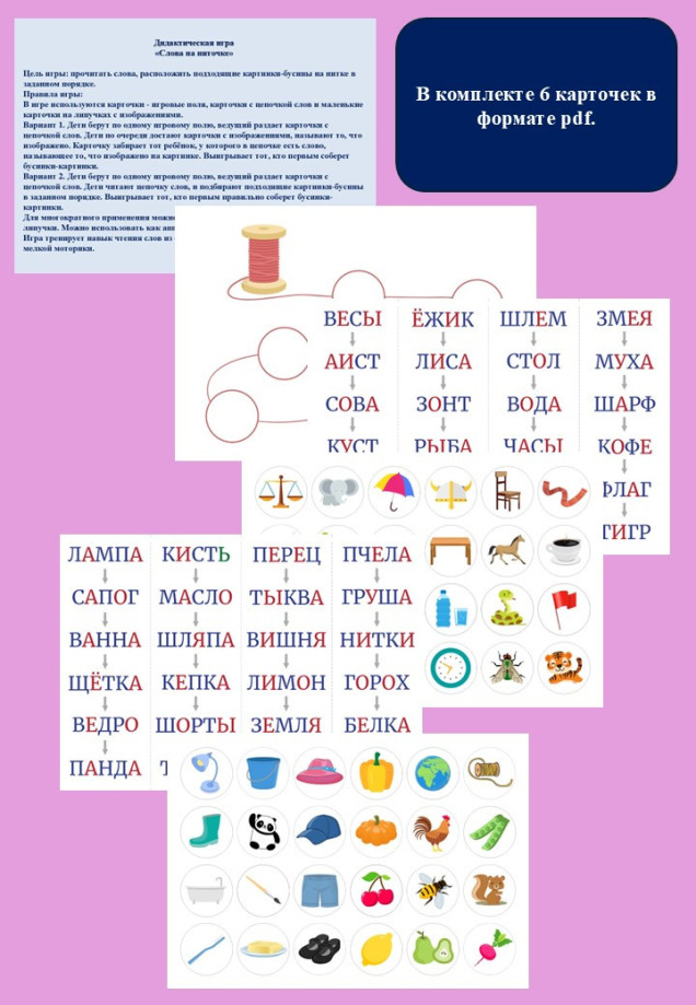 Цель игры: прочитать слова, расположить подходящие картинки-бусины на нитке в заданном порядке.