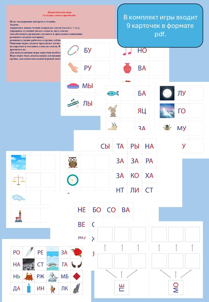 Описание игры: педагог предлагает детям посмотреть на картинку, изображенную на карточке и составить слово из слогов. В процессе составления слов, дети должны прочитать их.