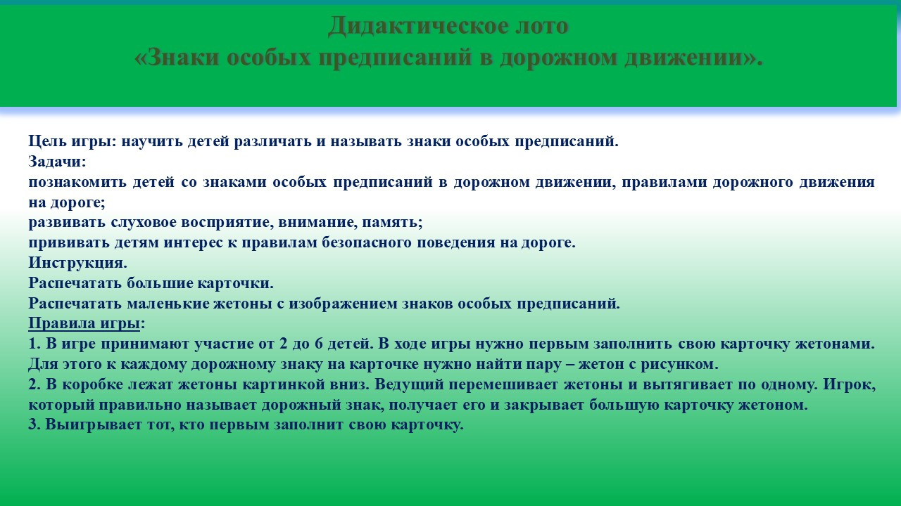Цель игры: научить детей различать и называть знаки особых предписаний в дорожном движении.