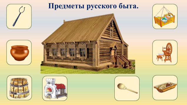 Дети рассматривают имеющиеся у них карточки и по очереди выкладывают их на карту ведущего, называя предметы русского быта, изображенные на карточке.