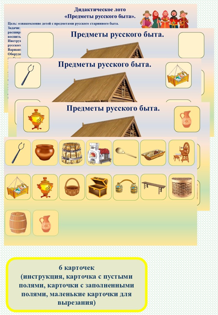 Инструкция: распечатать большие карточки. Распечатать маленькие карточки с изображением предметов русского быта.