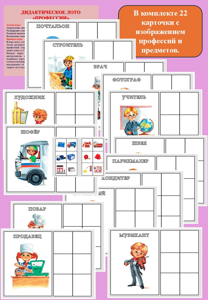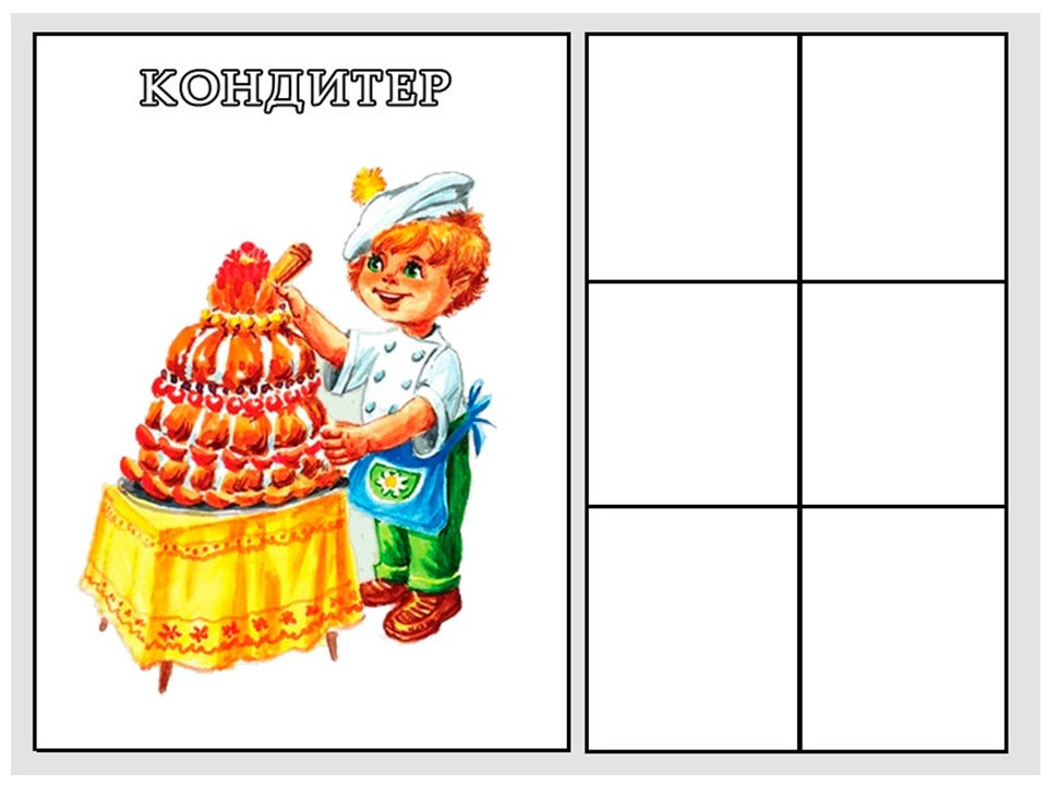 Детям раздаются карточки с изображением людей, занимающихся какой-либо профессией. Справа от изображения размещены 6 пустых поля. Один ребенок может взять от 2 до 3 - 4 карточек.