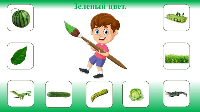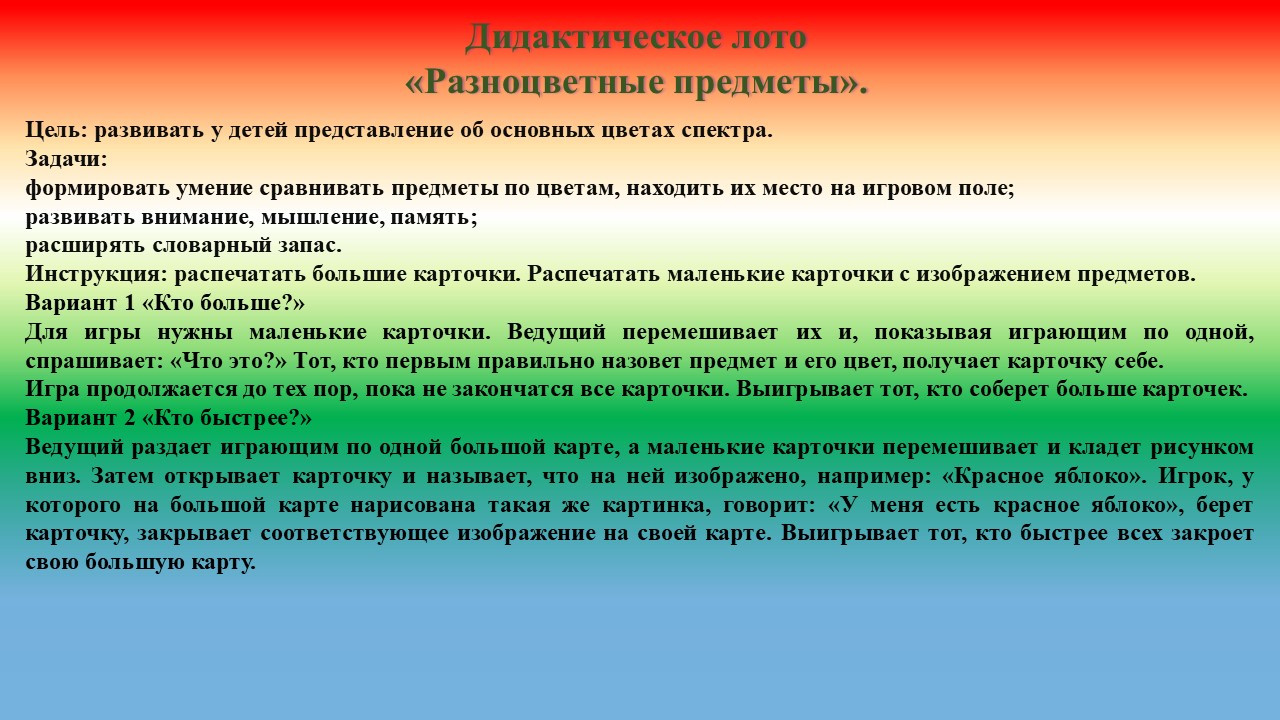 Для игры нужны маленькие карточки. Ведущий перемешивает их и, показывая играющим по одной, спрашивает: «Что это?» Тот, кто первым правильно назовет предмет и его цвет, получает карточку себе.