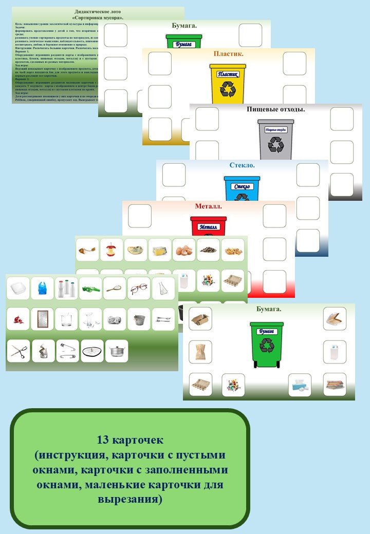 Инструкция: Распечатать большие карточки. Распечатать маленькие карточки с изображением мусора и вырезать их.