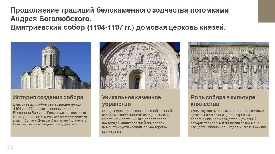 Андрей Боголюбский отказался от притязаний на Киев и перенес столицу во Владимир, сконцентрировав усилия на развитии Владимиро-Суздальского княжества как центра политической и культурной жизни региона. На 1150-1170-е гг. приходится активность белокаменного строительства, что косвенно свидетельствует об укреплении мощи и статуса княжества. Успенский и Дмитровский соборы во Владимире, Покрова на Нерли, Георгиевский собор в Юрьеве Польском стали визитными карточками русской средневековой архитектуры и не только восхищают своим великолепием, но и отражают духовные и художественные поиски своего времени.
