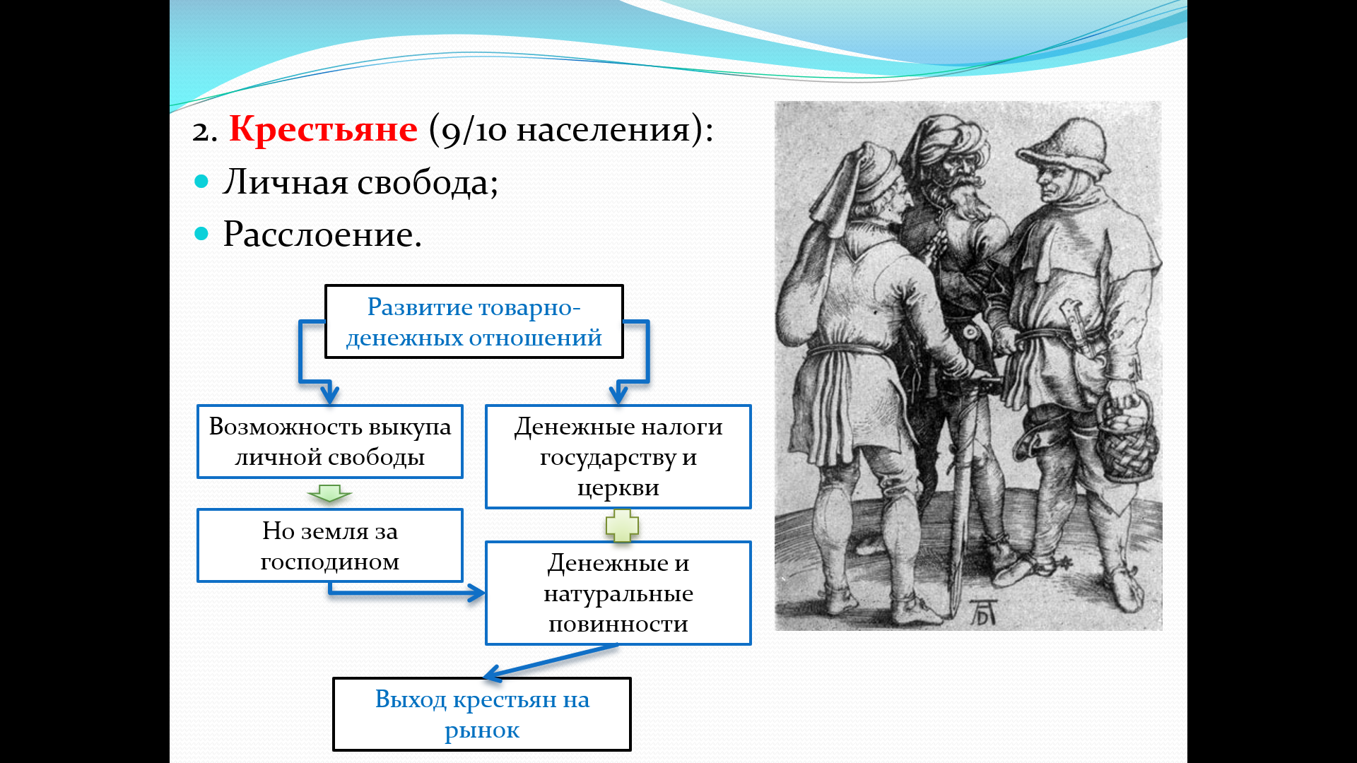 Раскрыть изменения в положении крестьянства (личная свобода, расслоение, выход на рынок).