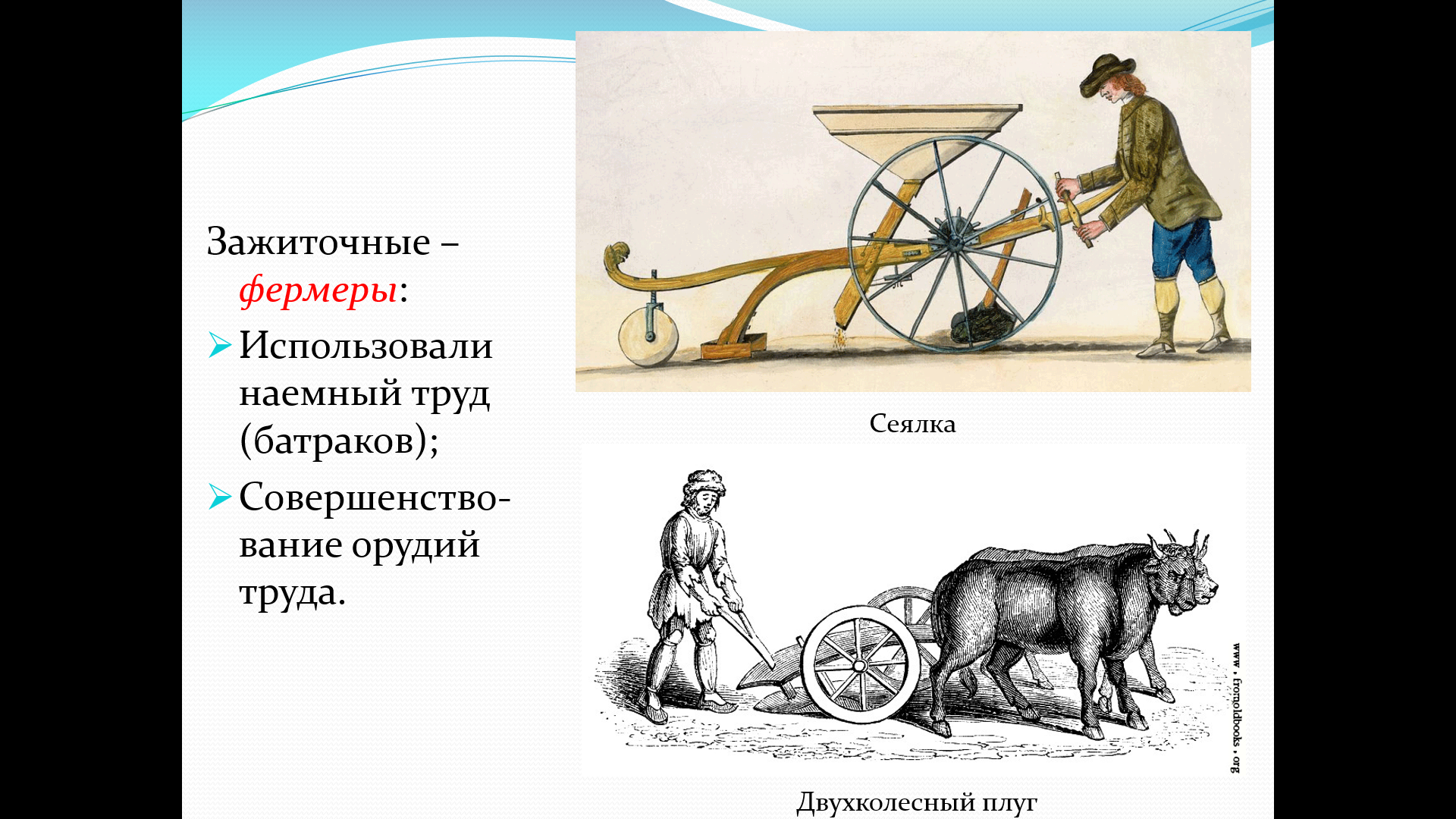 Наглядность: Чёткие схемы социальной структуры, иллюстрации (сеялка, двухколесный плуг).