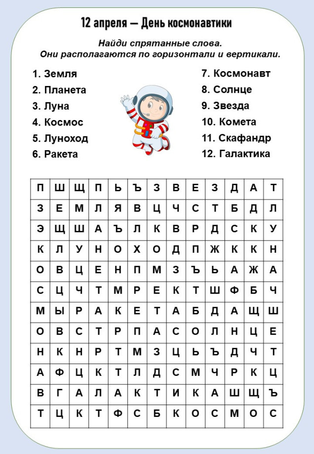 Слова: Земля, планета, Луна, космос, луноход, ракета, космонавт, Солнце, звезда, комета, скафандр, галактика.