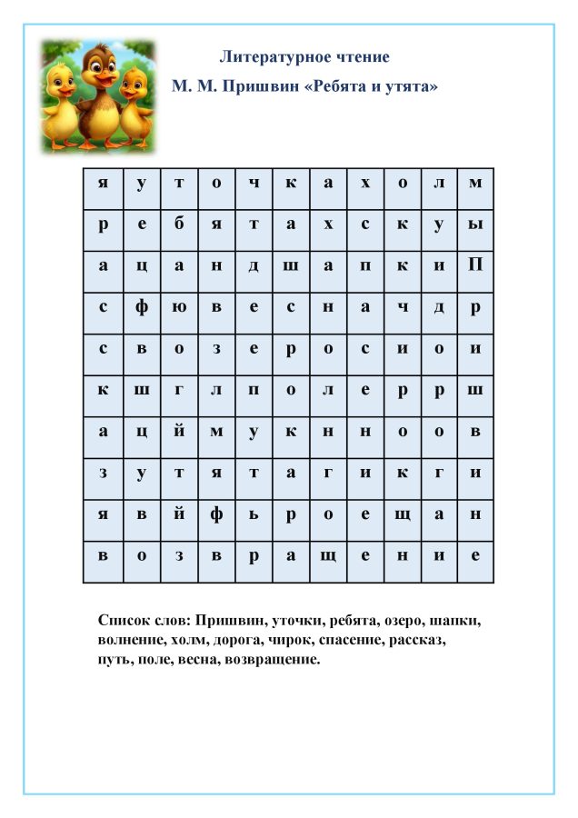 Филворд по рассказу Михаила Михайловича Пришвина «Ребята и утята» составлен из 15 слов и предназначен для учащихся начальной школы - 2 класса.
