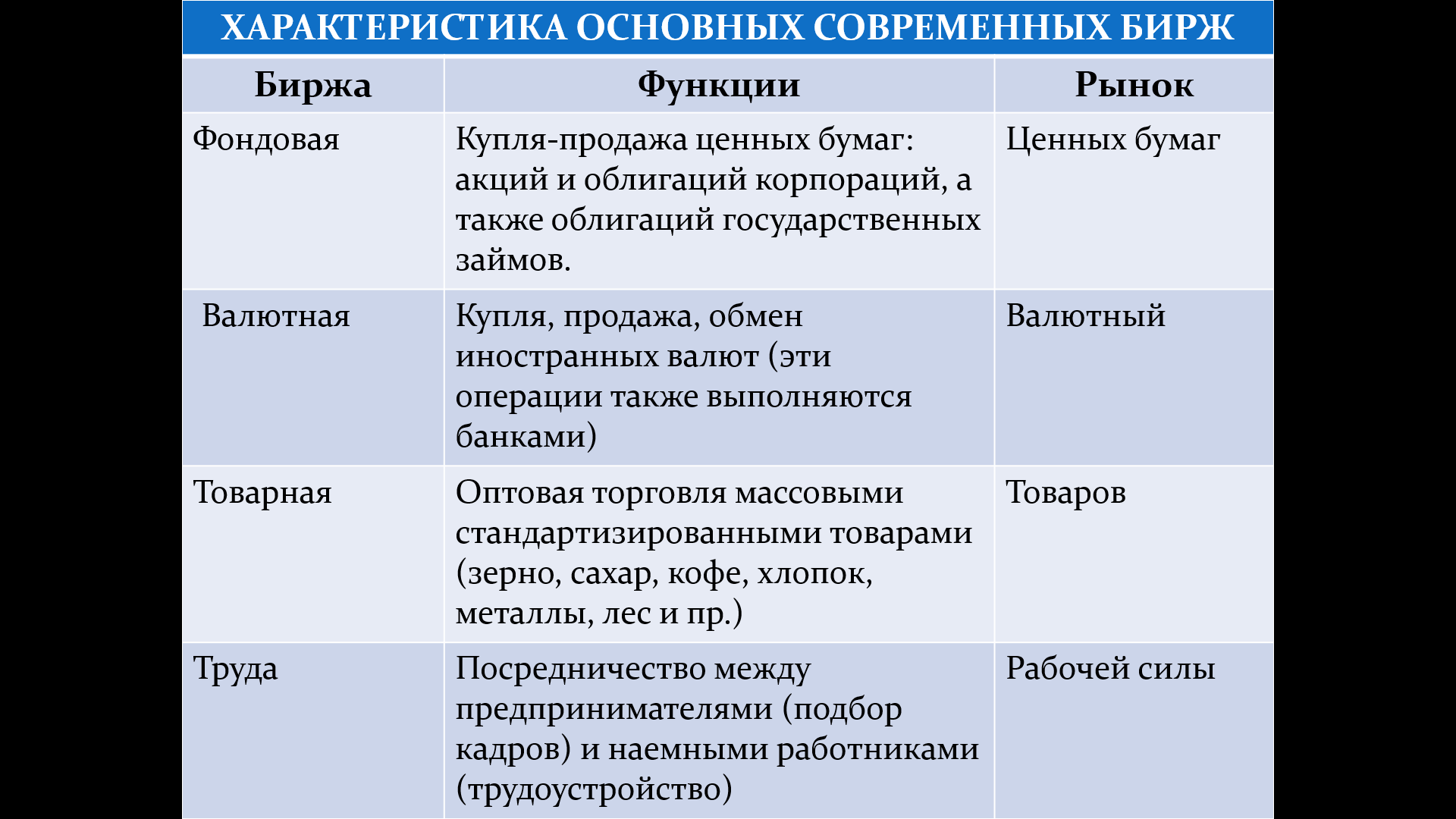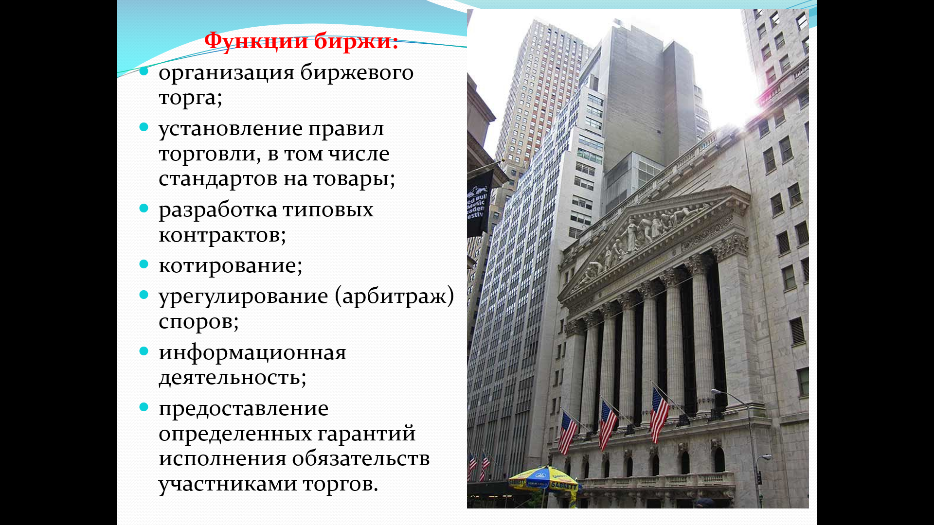 Функции биржи: организация торгов, установление правил, разработка контрактов, котирование, арбитраж споров, информационная деятельность, гарантии исполнения обязательств.