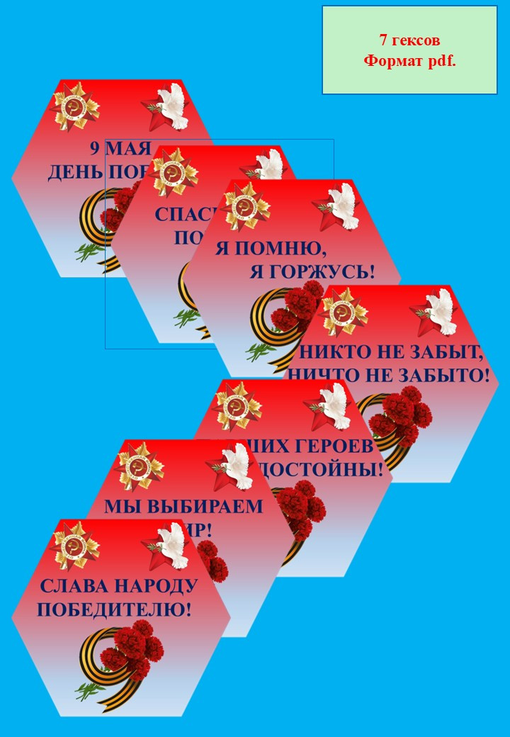 Гексы "День Победы" предназначены для оформления стендов, стен, досок ко Дню Победы. Можно применять для оформления как детских садов, так и школьных кабинетов.
