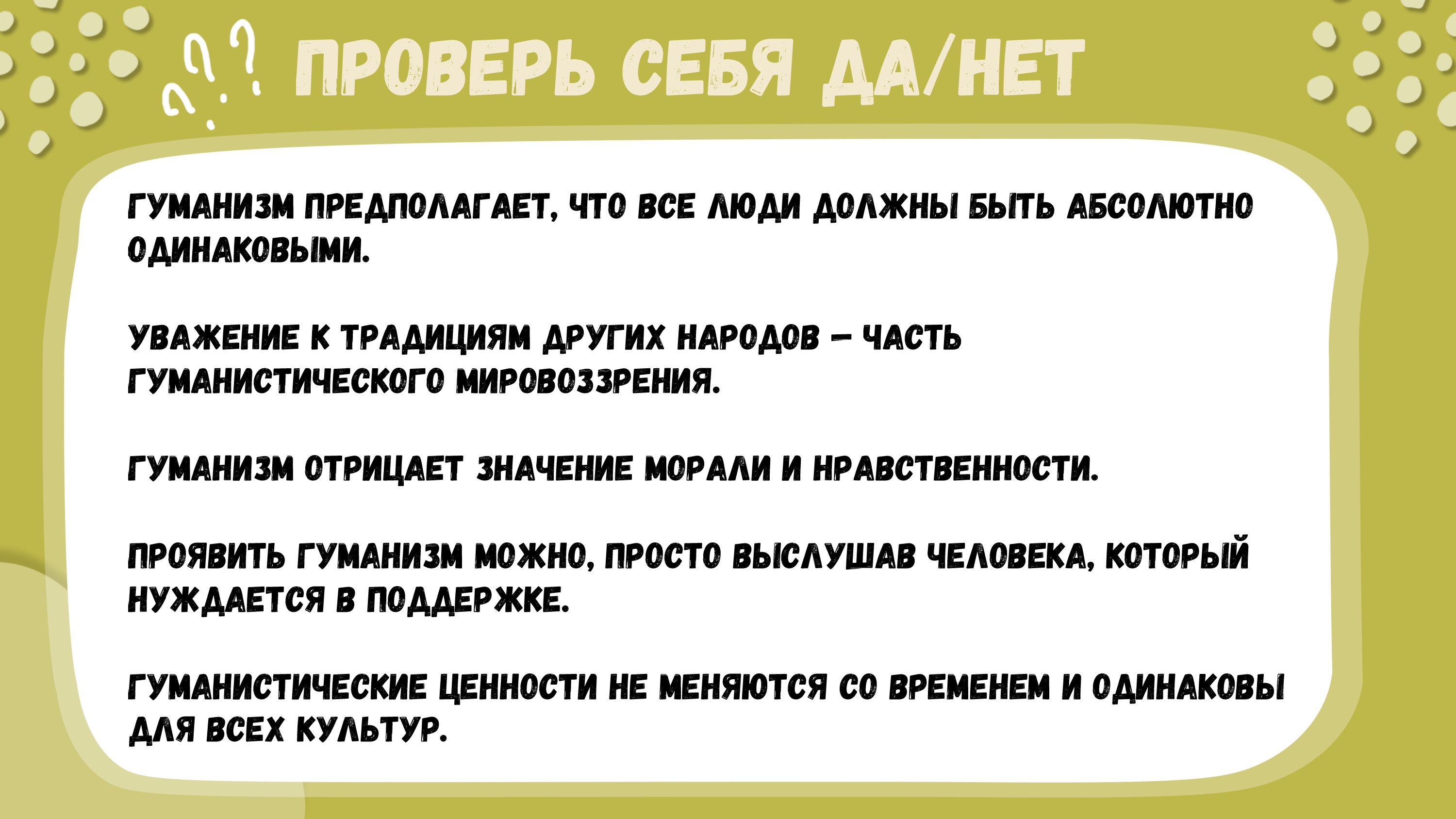- — научатся приводить примеры гуманистических традиций в истории и современности;