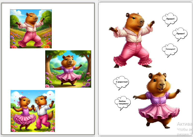 Игровой ролевой набор "Танцующие капибары" для детей дошкольного возраста в формате OpenDocument (ODF). Включает в себя 3 страницы с картинками мило танцующих капибар. Использовать для игры вырезалки, скрапбукинга, наклейки, постеры.