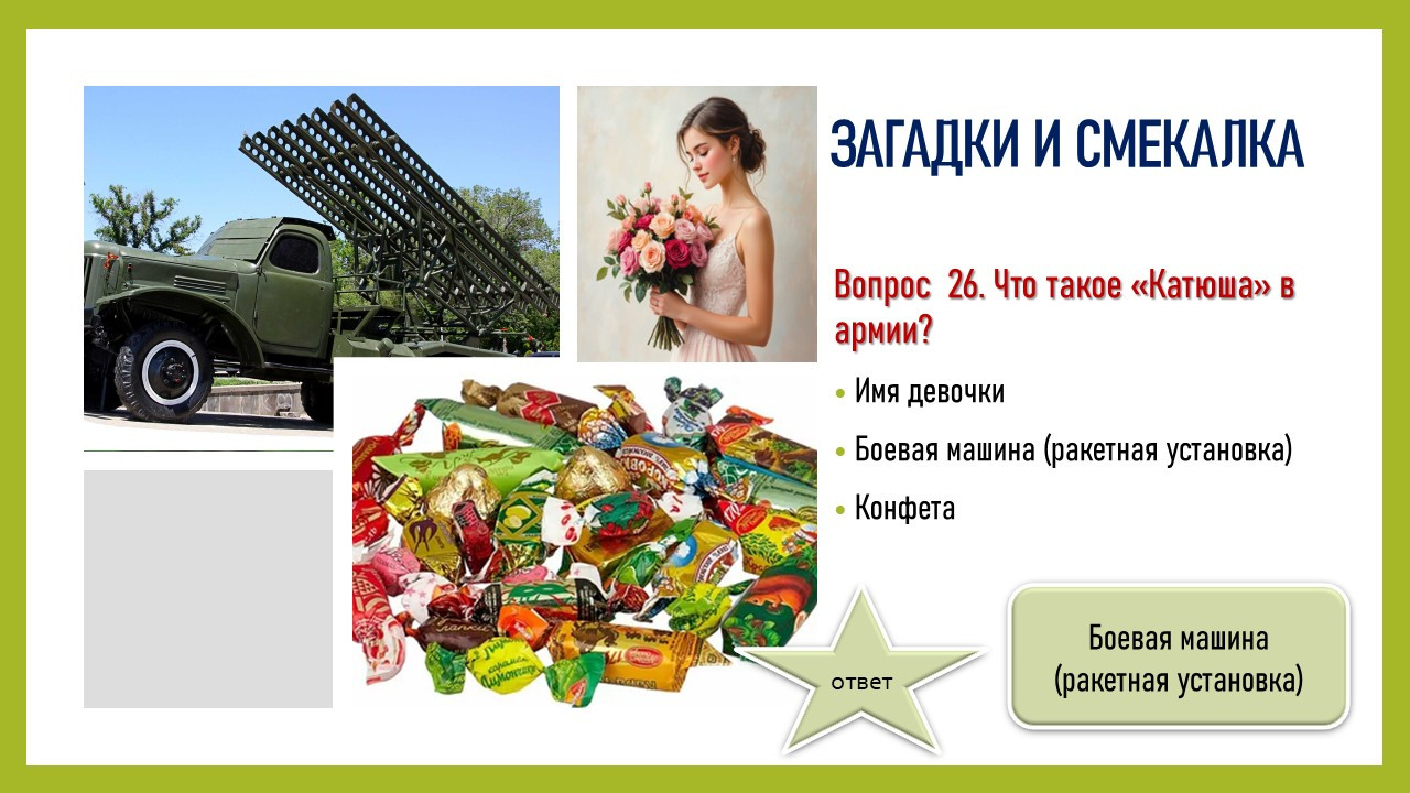 Викторина представляет собой яркую презентацию, состоящую из 30 вопросов, посвященных истории праздника, военной технике, профессиям и известным личностям, связанным с армией России.