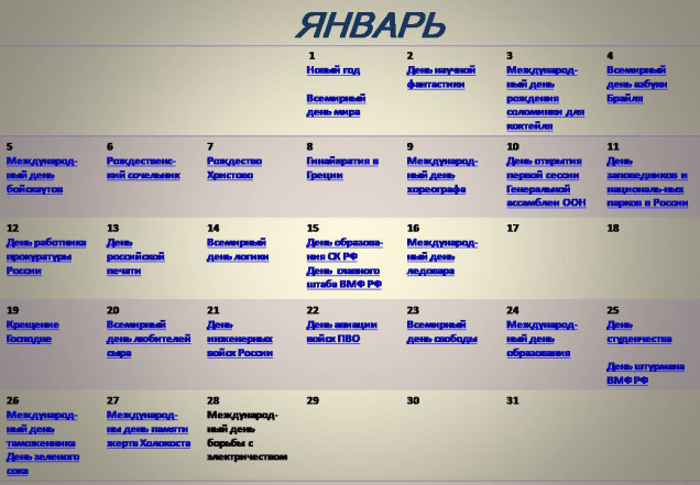 В интерактивном календаре международных и российских праздников и памятных дней на январь есть международные праздники, учреждённые ООН или Юнеско и российские праздники. Календарь содержит названия международных и российских праздников по датам января 2026 года. С каждого наименования праздника по гиперссылке можно перейти к информации о возникновении, значении, традициях и обычаях их празднования.