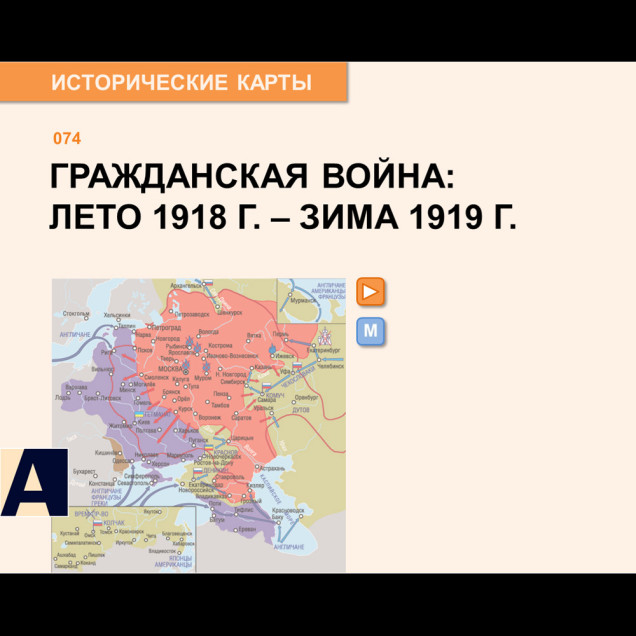 Карта "Гражданская война летом 1918 – зимой 1919 гг." Интерактивная карта (презентация Power Point) с пояснительным текстом и заданиями для учеников.