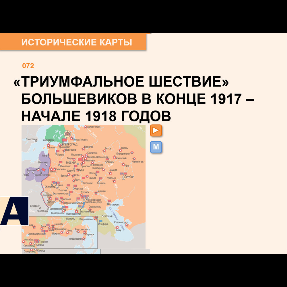 Карта - «Триумфальное шествие» большевиков в конце 1917 – начале 1918 годов Интерактивная карта (презентация Power Point) с пояснительным текстом и заданиями для учеников.