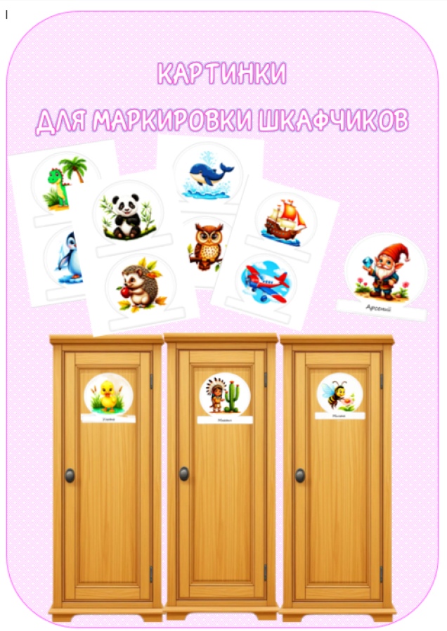 В разработке представлены двадцать восемь (28) картинок в силуэтной картинке с местом для указания имени ребёнка. Картинки подобраны, как для мальчиков, так и для девочек. Картинки можно распечатать в типографии на бумаге с клейкой основой, можно распечатать и заламинировать.