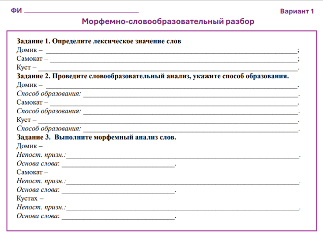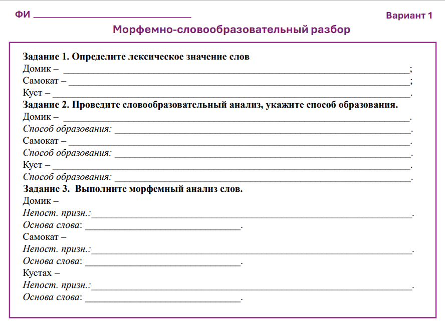 В каждом варианте по 3 задания: дать определение словам, провести словообразовательный анализ, провести морфемный анализ. Такой порядок максимально эффективен для оценки знаний и умений обучающихся.