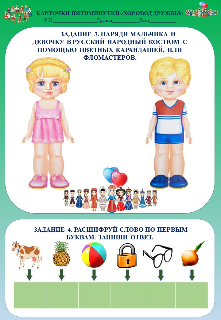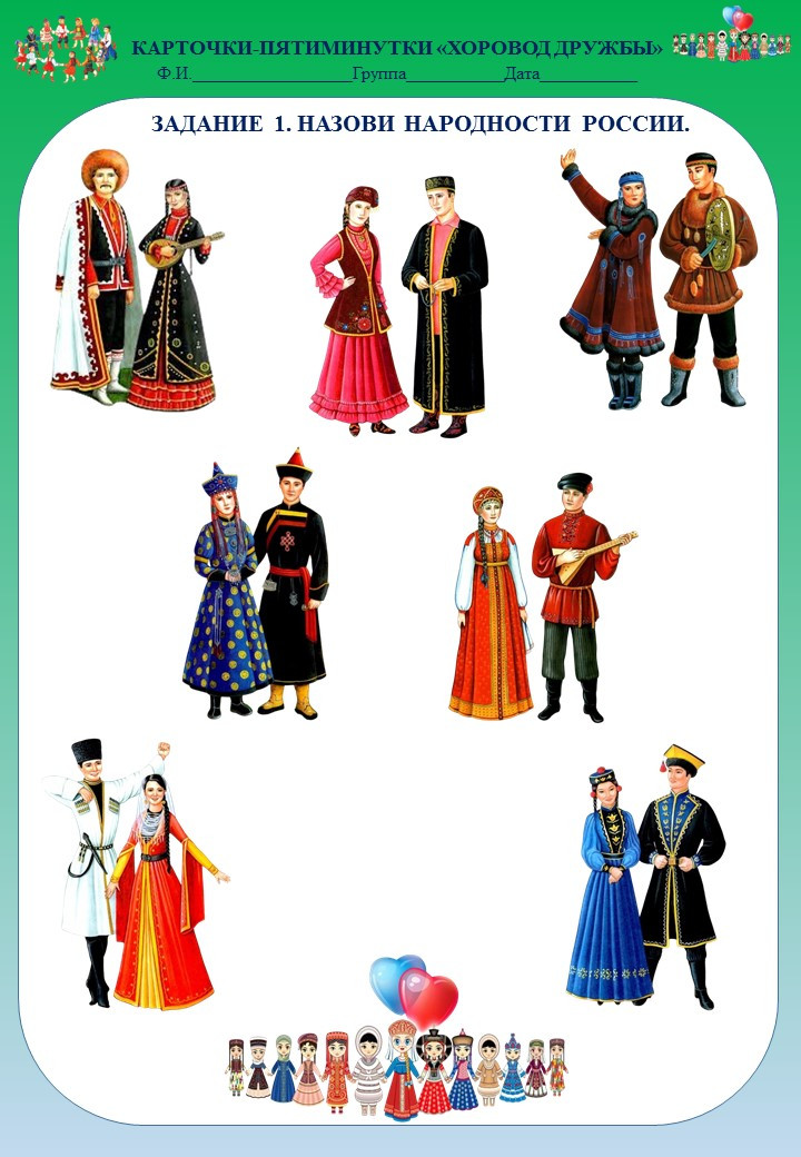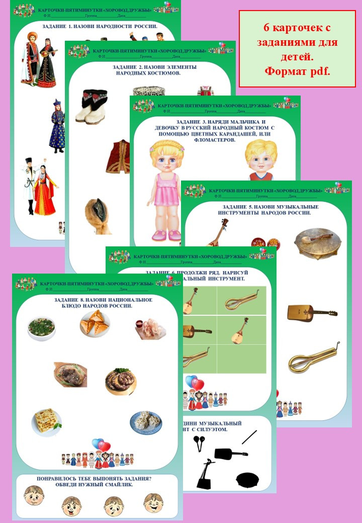 Карточки-пятиминутки "Хоровод дружбы" позволят в игровой форме познакомить детей старшего дошкольного возраста и младшего школьного возраста с традициями и культурой некоторых народов России (калмыки, чукчи, татары, башкиры, чеченцы, буряты, русские) . Дети узнают об элементах костюмов народов, народных музыкальных инструментах, национальных блюдах.