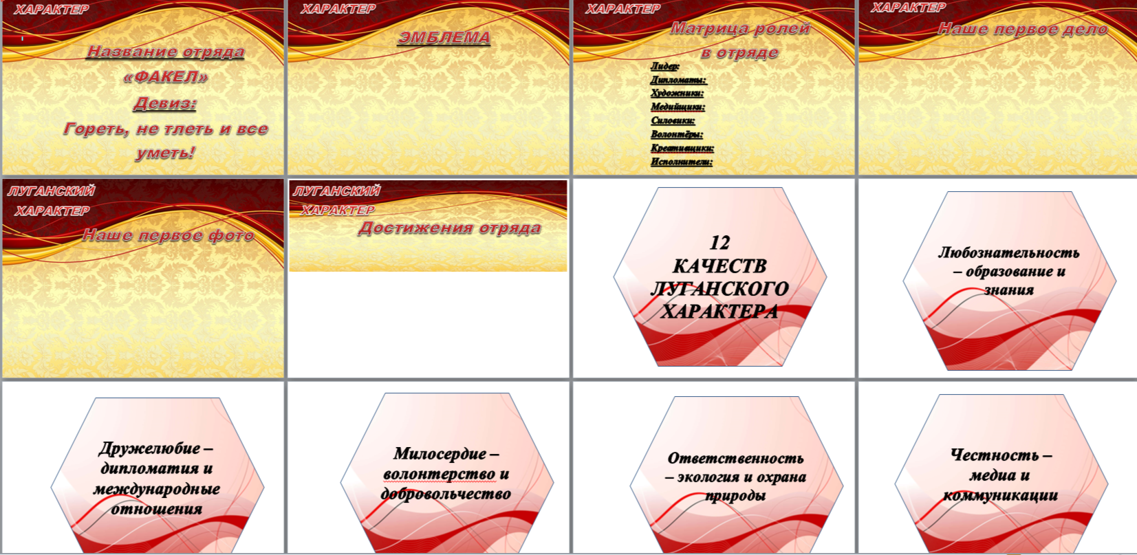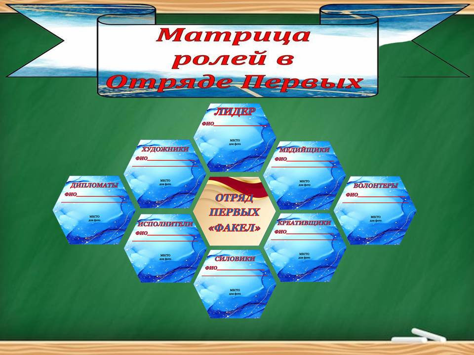 В классном уголке размещены название отряда, девиз и эмблема. Также есть перечень распределения обязанностей в отряде. Если детей в классе много, на одну функцию можно вписать несколько ребят, чтобы получилась мини-подгруппа, которая будет заниматься в данном направлении. Также можно разместить фото вашего первого общего дела в классе и запечатлеть первое фото с классом. В наборе для стенда идут еще соты с перечислением 12 видов характера (направления деятельности отряда)