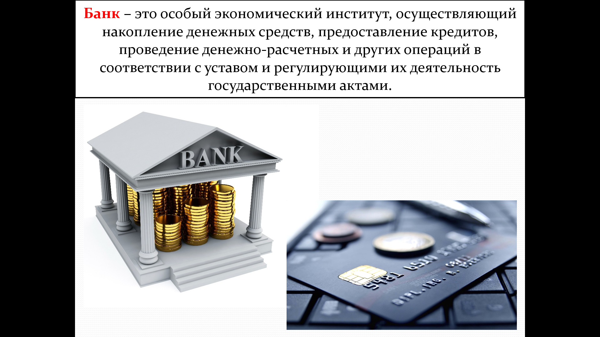 «Банки и банковская система» — раскрывает понятие банка, структуру банковской системы (Центральный банк и коммерческие банки), функции Центробанка, источники прибыли коммерческих банков, классификацию и рейтинги банков, виды кредитов (потребительский кредит, кредитная карта).