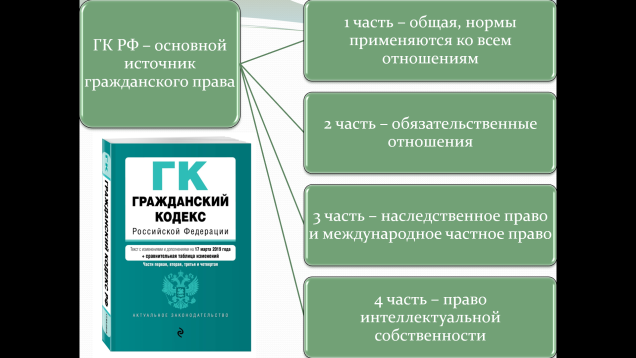 «Общие положения гражданского права» — знакомит с понятием гражданского права, предметом регулирования, отличительными особенностями гражданско-правовых отношений. Содержит разбор жизненных ситуаций: «любовный договор» против реальной сделки купли-продажи, злоупотребление правом.
