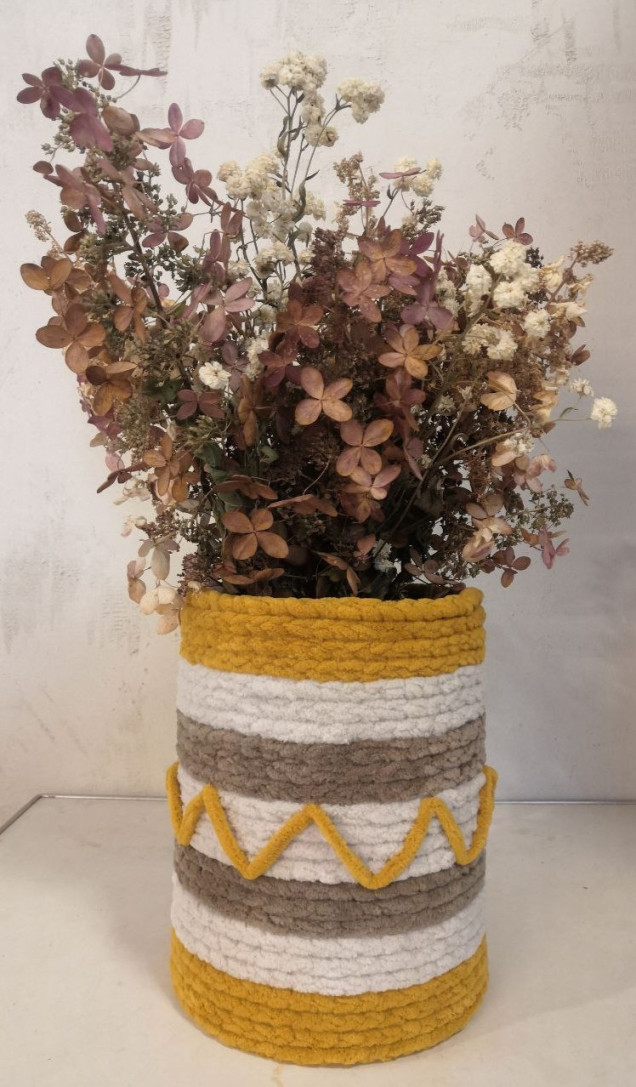 декоративная корзина цилиндрической формы из обрезков линолеума декорированная пряжей, практична, легка в исполнении.