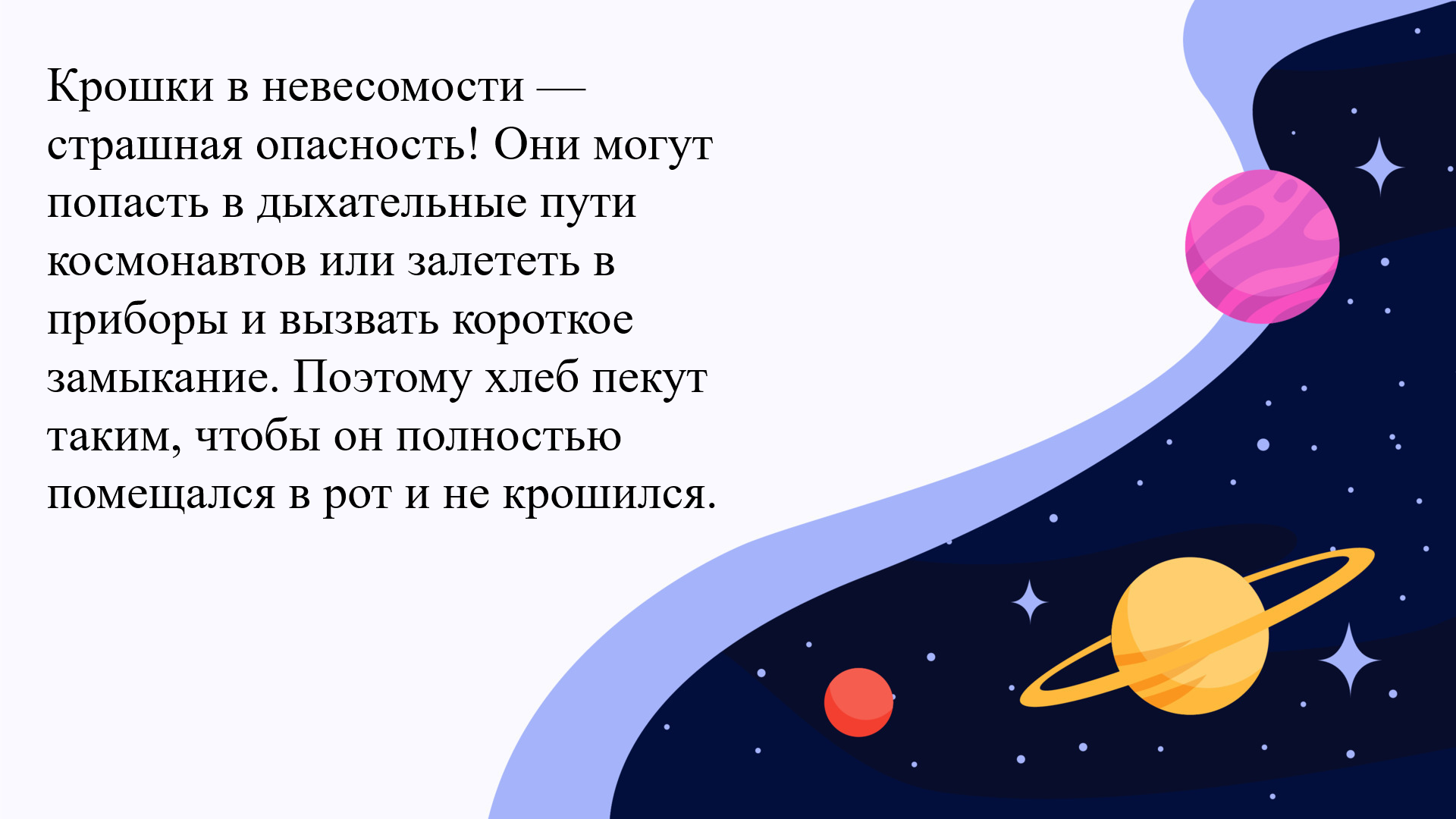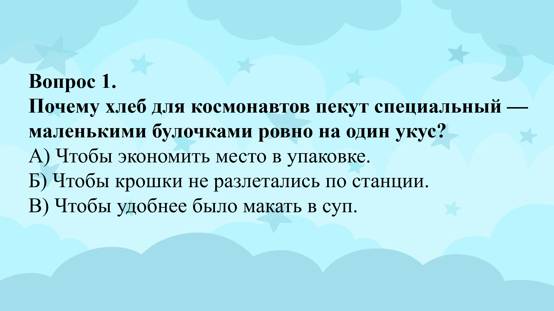Эта викторина идеально подойдёт для школьных команд, детских лагерей и всех, кто мечтает о космосе. Юные участники не только проверят свою логику и эрудицию, но и узнают множество удивительных фактов о том, как человек приспосабливается к самым экстремальным условиям.