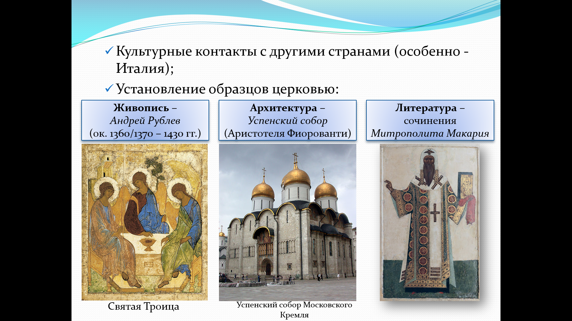 Презентация позволяет учащимся увидеть, как в XVI веке, после освобождения от ордынского ига и объединения государства, русская культура пережила настоящий подъём. Материал показывает, как в литературе, архитектуре, живописи и музыке отражались идеи сильной власти, патриотизма и религиозности, а также как активно развивались контакты с другими странами, особенно с Италией.