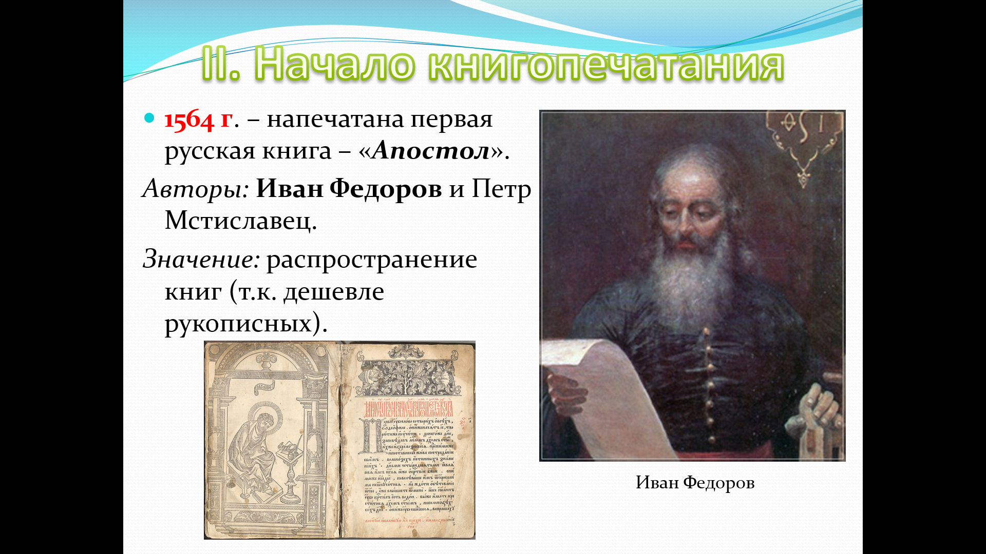 Рассмотреть начало книгопечатания (Иван Фёдоров, «Апостол»).